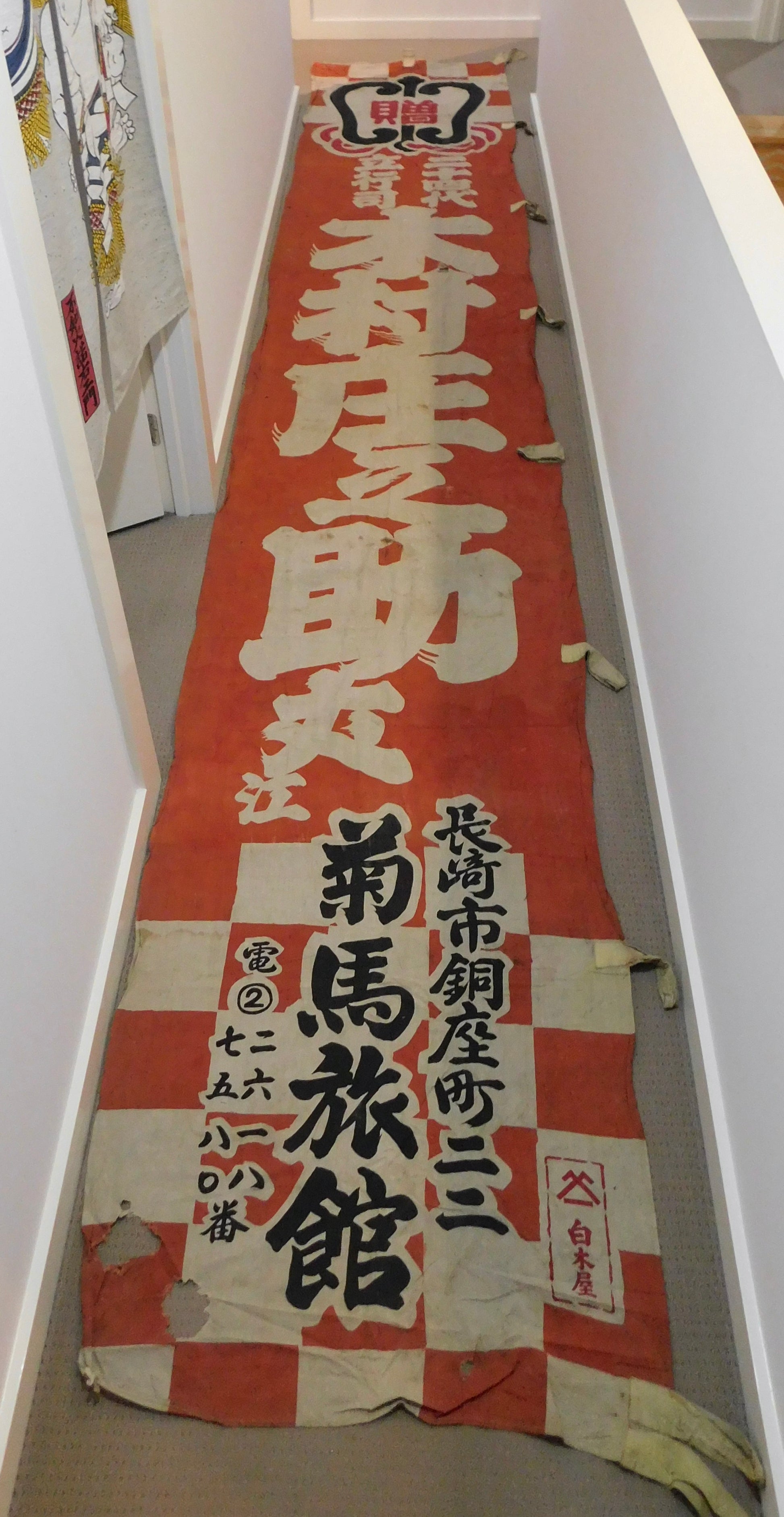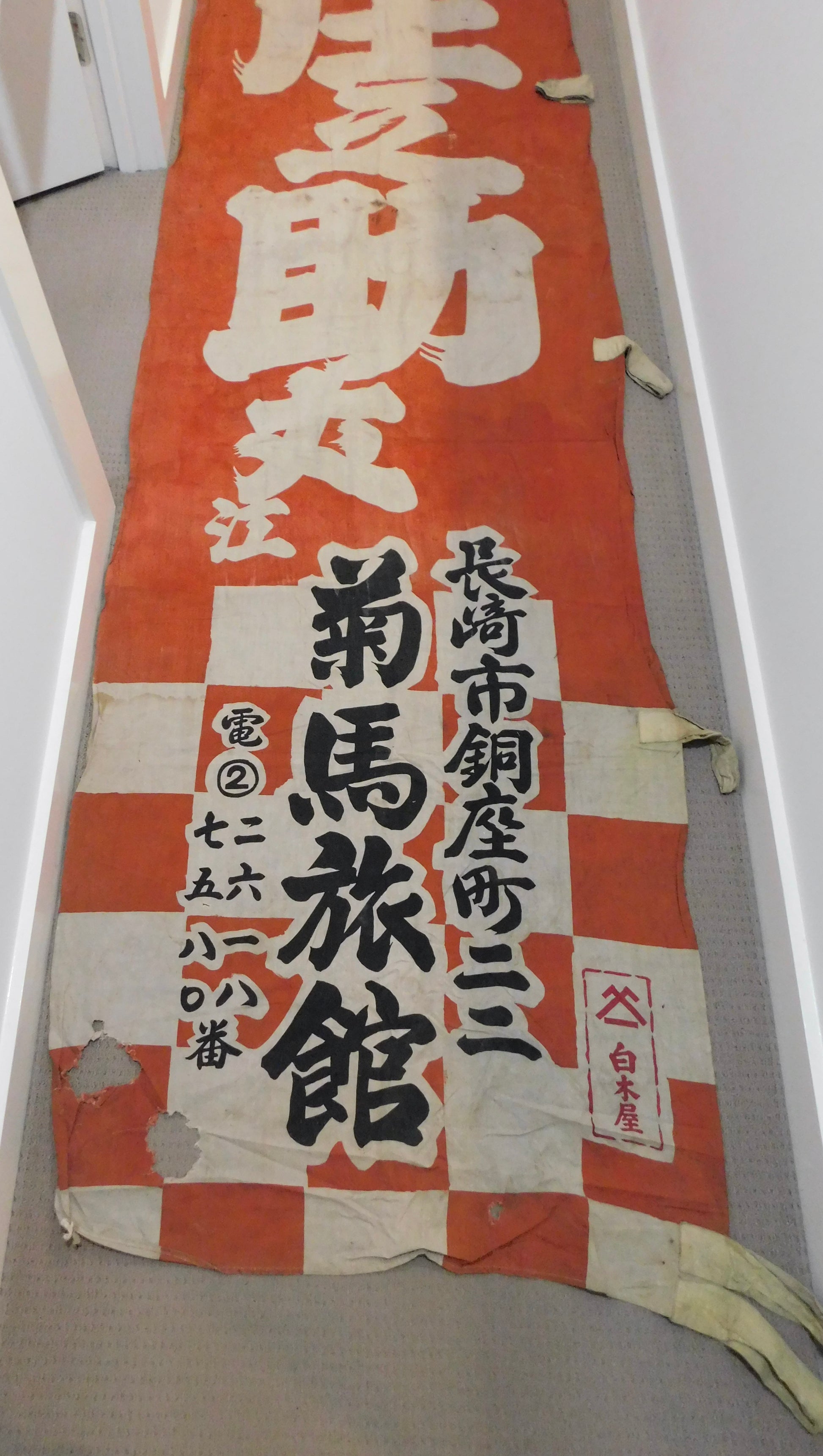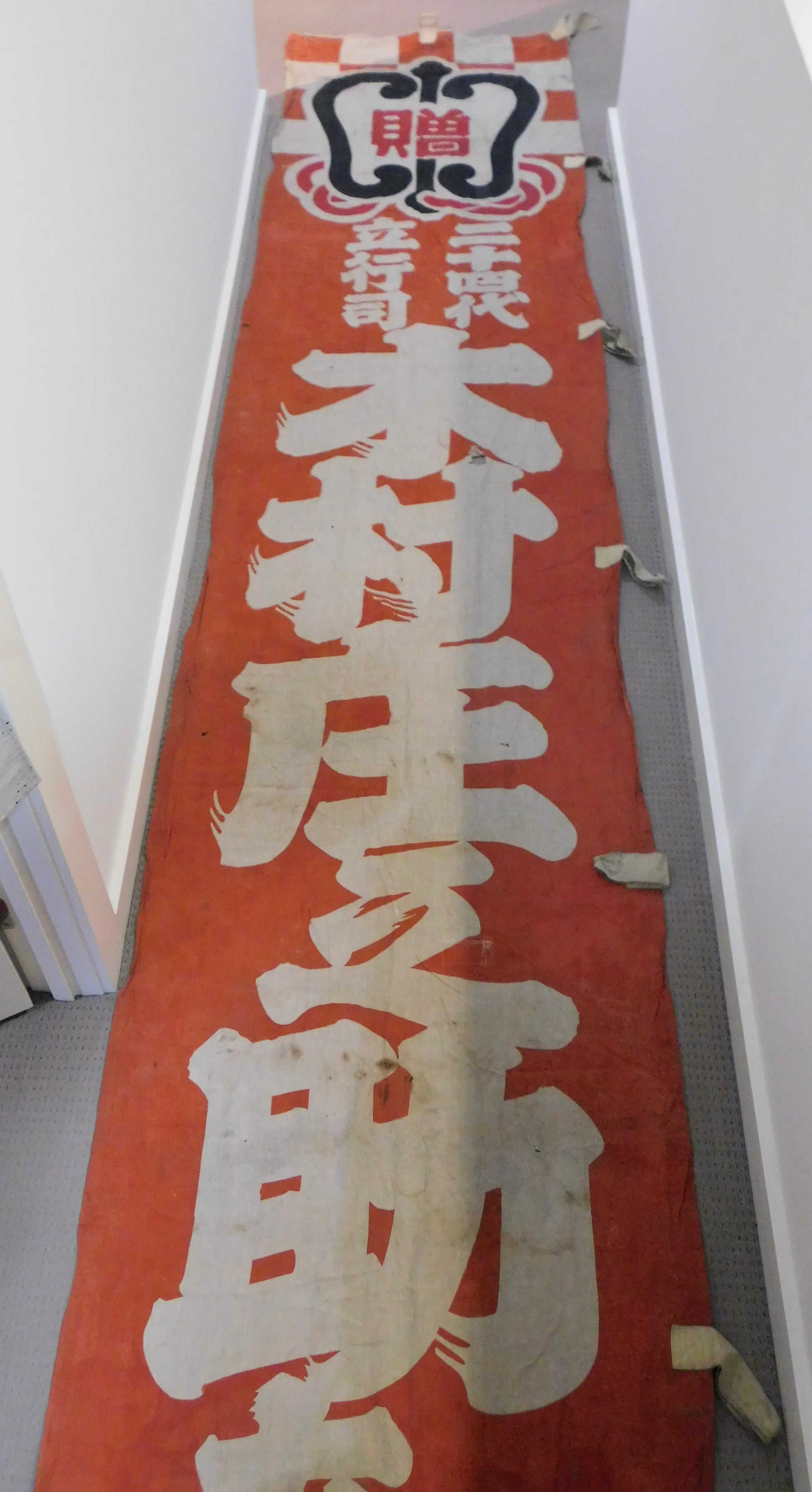 This nobori is more antique than display item - and is showing its age. It is over 50years old.