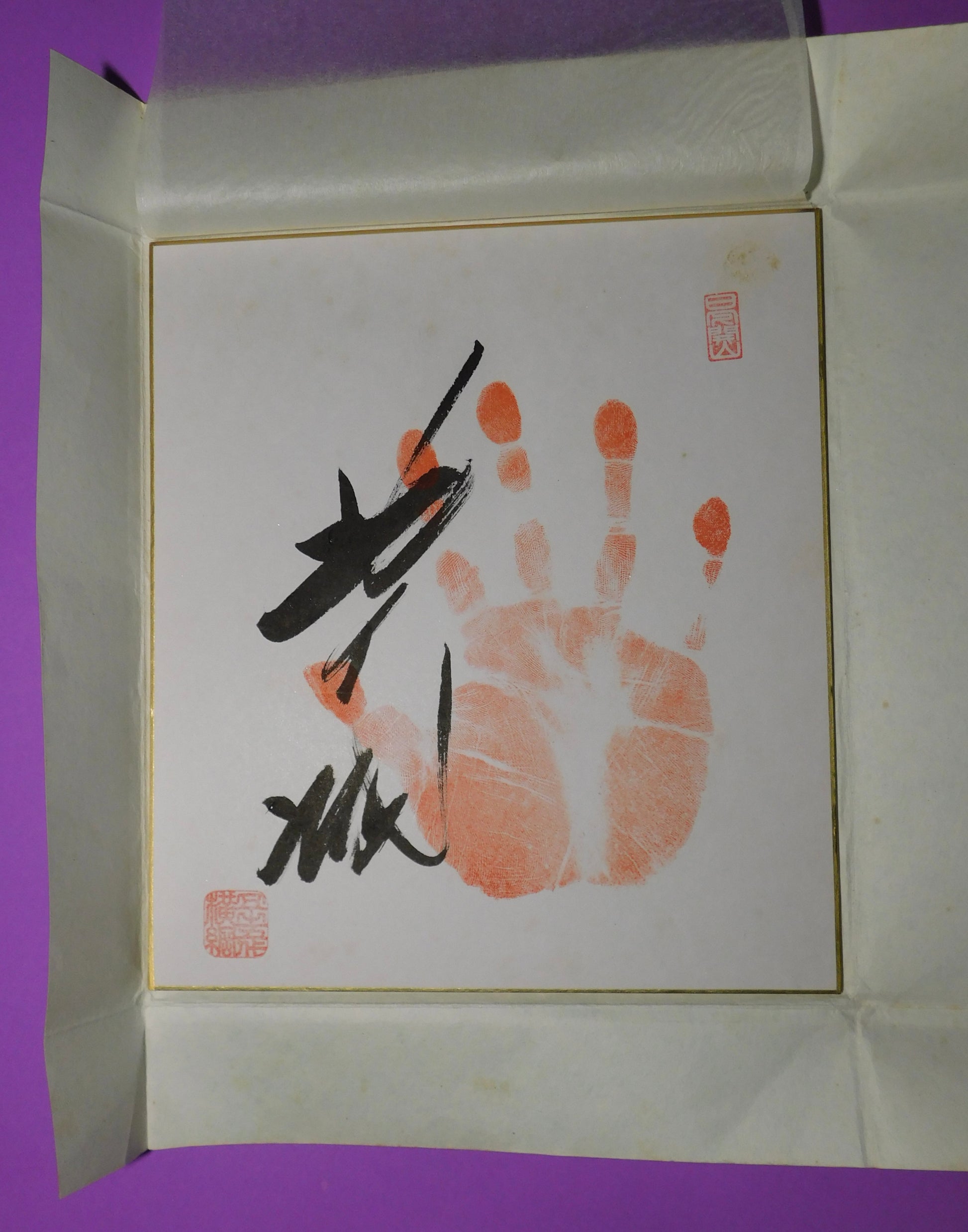 This example is in red, and in excellent condition in original washi paper cover with Yokozuna and name stamp. The cover has age marks, but the tegata is relatively fresh for its age (50 years).